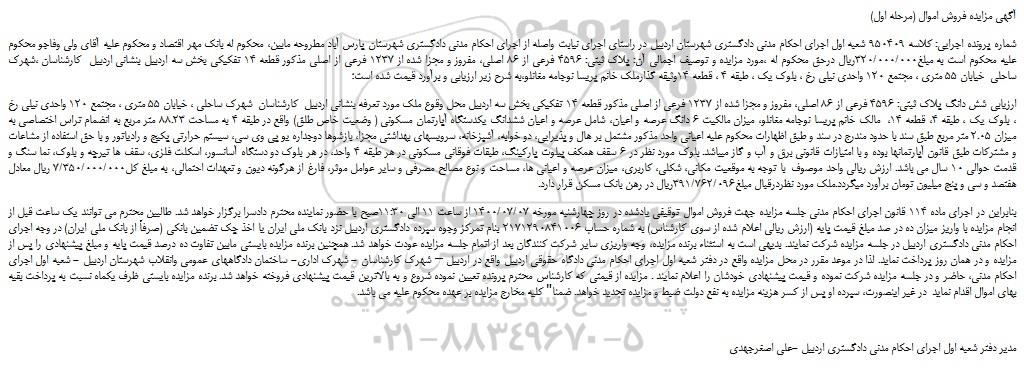 شماره پرونده اجرایی: کلاسه 950409 شعبه اول اجرای احکام مدنی دادگستری شهرستان اردبیل در راستای اجرای نیابت واصله از اجرای احکام مدنی دادگستری شهرستان پارس آباد مطروحه مابین، محکوم له بانک مهر اقتصاد و محکوم علیه آقای ولی وفاجو محکوم علیه محکوم است به مبلغ320/000/000ریال درحق محکوم له ،مورد مزایده و توصیف اجمالی آن: پلاک ثبتی: 4596 فرعی از 86 اصلی، مفروز و مجزا شده از 1237 فرعی از اصلی مذکور قطعه 14 تفکیکی بخش سه اردبیل بنشانی اردبیل  کارشناسان ،شهرک ساحلی  خیابان 55 متری ، مجتمع 120 واحدی نیلی رخ ، بلوک یک ، طبقه 4 ، قطعه 14وثیقه گذارملک خانم پریسا نوجامه مغانلو،به شرح زیر ارزیابی و برآورد قیمت شده است؛