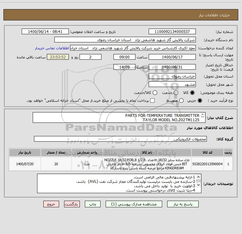نام دستگاه خریدار:شرکت پالایش گاز شهید هاشمی نژاد استان خراسان رضوی