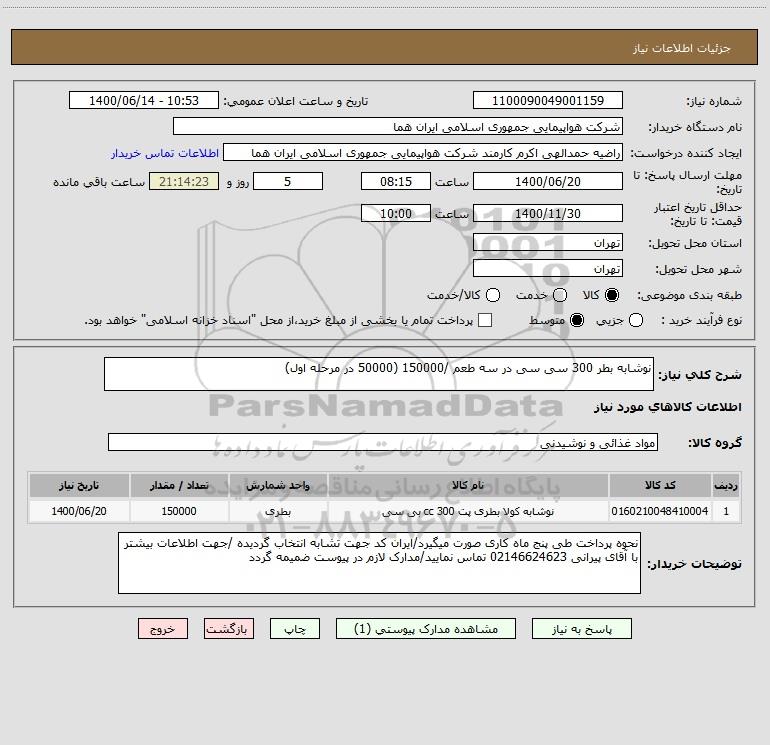شرح کلی نیاز: نوشابه بطر 300 سی سی در سه طعم /150000 (50000 در مرحله اول)