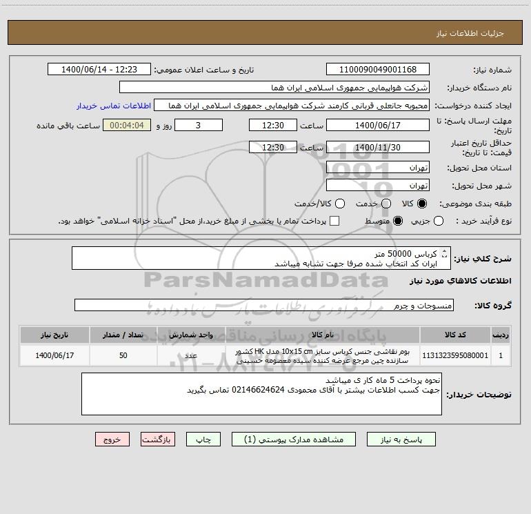 شرح کلی نیاز: کرباس 50000 متر ایران کد انتخاب شده صرفا جهت تشابه میباشد