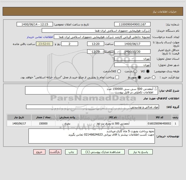 شرح کلی نیاز: آبمعدنی 500 سی سی 150000 عدد