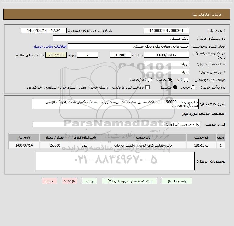 شرح کلی نیاز: چاپ و ارسال 150000 عدد پاکت مطابق مشخصات پیوست/ارسال مدارک تکمیل شده به بانک الزامی است/75358207