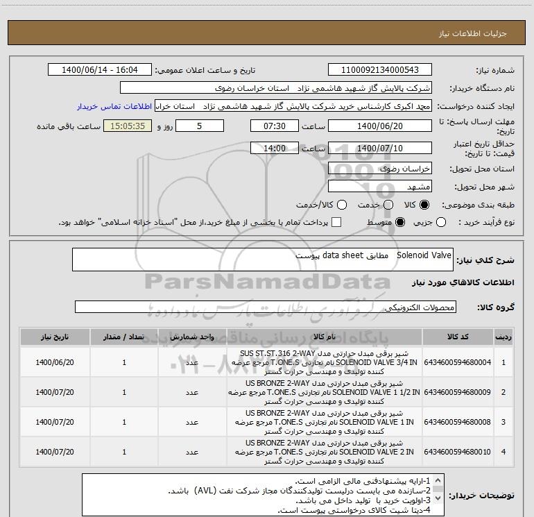 استعلام Solenoid Valve مطابق data sheet پیوست , استعلام Solenoid Valve مطابق data sheet پیوست