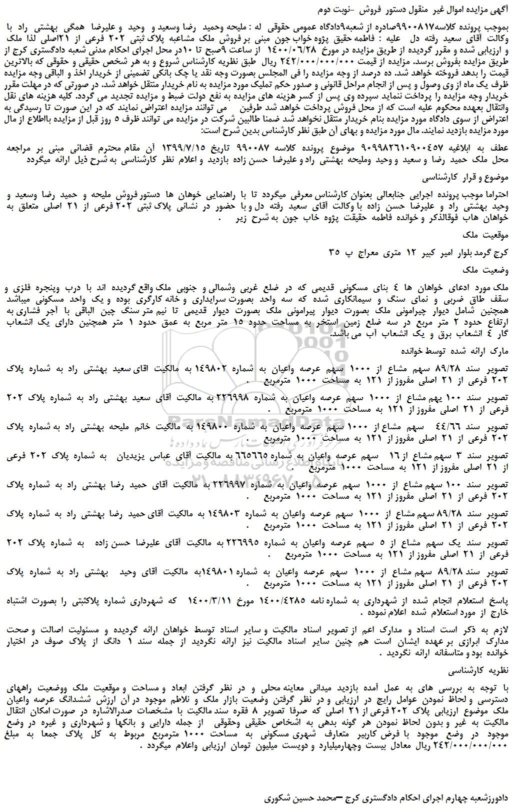 بموجب پرونده کلاسه9900817صادره از شعبه9دادگاه عمومی حقوقی له : ملیحه وحمید رضا وسعید و وحید و علیرضا همگی بهشتی راد با وکالت آقای سعید رفته دل علیه : فاطمه حقیق پژوه خواب جون مبنی بر فروش ملک مشاعبه پلاک ثبتی 202 فرعی از 21اصلی لذا ملک و ارزیابی شده و مقرر گردیده از طریق مزایده در مورخ 1400/06/28 از ساعت 9صبح تا 10در محل اجرای احکام مدنی شعبه دادگستری کرج از طریق مزایده بفروش برسد. مزایده از قیمت 242/000/000/000 ریال طبق نظریه کارشناس شروع و به هر شخص حقیقی و حقوقی که بالاترین قیمت را بدهد فروخته خواهد شد. ده درصد از وجه مزایده را فی المجلس بصورت وجه نقد یا چک بانکی تضمینی از خریدار اخذ و الباقی وجه مزایده ظرف یک ماه از وی وصول و پس از انجام مراحل قانونی و صدور حکم تملیک مورد مزایده به نام خریدار منتقل خواهد شد. در صورتی که در مهلت مقرر خریدار وجه مزایده را پرداخت ننماید سپرده وی پس از کسر هزینه های مزایده به نفع دولت ضبط و مزایده تجدید می گردد. کلیه هزینه های نقل وانتقال بعهده محکوم علیه است که از محل فروش پرداخت خواهد شد طرفین می توانند مزایده اعتراض نمایند که در این صورت تا رسیدگی به اعتراض از سوی دادگاه مورد مزایده بنام خریدار منتقل نخواهد شد ضمنا طالبین شرکت در مزایده می توانند ظرف 5 روز قبل از مزایده بااطلاع از مال مورد مزایده بازدید نمایند. مال مورد مزایده و بهای آن طبق نظر کارشناس بدین شرح است: