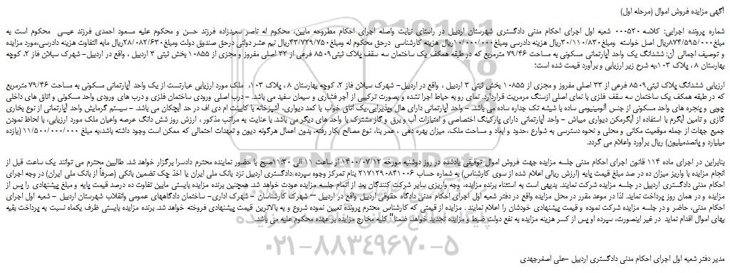 شماره پرونده اجرایی: کلاسه 000520 شعبه اول اجرای احکام مدنی دادگستری شهرستان اردبیل در راستای نیابت واصله اجرای احکام مطروحه مابین، محکوم له ناصر سعیدزاده فرزند حسن و محکوم علیه مسعود احمدی فرزند عیسی محکوم است به مبلغ874/595/000ریال اصل خواسته ومبلغ30/110/830ریال هزینه دادرسی ومبلغ10/000/000ریال هزینه کارشناسی درحق محکوم له ومبلغ43/729/750ریال نیم عشر دولتی درحق صندوق دولت ومبلغ28/082/630ریال مابه التفاوت هزینه دادرسی،مورد مزایده و توصیف اجمالی آن: ششدانگ یک واحد آپارتمانی مسکونی به مساحت 79/46 مترمربع که در طبقه همکف یک ساختمان سه سقف پلاک ثبتی8509 فرعی از 33 اصلی مفروز و مجزی از 10855 بخش ثبتی 3 اردبیل ، واقع در اردبیل- شهرک سبلان فاز 2، کوچه بهارستان 8 ، پلاک 103،به شرح زیر ارزیابی و برآورد قیمت شده است؛