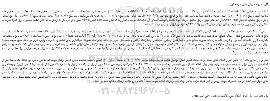 شماره پرونده اجرایی: کلاسه 9902256 شعبه اول اجرای احکام مدنی دادگستری شهرستان اردبیل در راستای دادنامه صادره ازشعبه4داگاه عمومی حقوقی اردبیل مطروحه مابین، محکوم له ناصرباقری وبهلول علی پور و محکوم علیه لطیف عظیمی دولق محکوم علیه محکوم است به مبلغ330/607/143ریال اصل خواسته پرداخت خسارت تاخیر تادیه از تاریخ ابلاغ اظهار نامه 1399/04/24لغایت اجرای حکم ومبلغ10/311/250ریال هزینه دادرسی وابطال تمبر.مبلغ708/878ریال هزینه خدمات ومبلغ15/869/142ریال حق الوکاله وکیل درحق محکوم له ومبلغ16/530/357ریال نیم عشر دولتی درحق صندوق دولت ،مورد مزایده و توصیف اجمالی آن: ششدانگ عرصه و اعیان پلاک ثبتی شماره 556 فرعی از 327 اصلی واقع در بخش 3 اردبیل به نام آقای لطیف عظیمی دیولق فرزند قدرت به نشانی شهرستان اردبیل، جاده سردابه، روستای دیولق، میدان کشاورز، پلاک 252،به شرح زیر ارزیابی و برآورد قیمت شده است؛