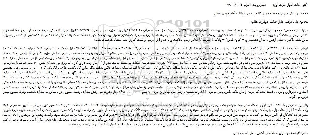 در راستای محکومیت محکوم علیه:ابراهیم خلیل عدالت جوفرزند مطلب به پرداخت : 1-مبلغ746/900/000ریال از بابت اصل خواسته ومبلغ26/513/400ریال بابت هزینه دادرسی ومبلغ35/857/360ریال حق الوکاله وکیل درحق محکوم لها  زهرا و فاطمه هر دو کاظمی جودی بوکالت آقای فریبرز لطفی  2- پرداخت مبلغ58/345/000ریال نیم عشر دولتی درحق صندوق دولت وصول خواهد شد. با توجه به درخواست محکوم له مبنی برتوقیف وفروش  ششدانگ ملک پلاک ثبتی 2248 فرعی از 829 فرعی از 33 اصلی اردبیل ، محل ملک مذکور به نشانی اردبیل ، خیابان شهیدیسری – کوچه قدس2 – پلاک 4  ،توسط کارشناس رسمی دادگستری به شرح ذیل ارزیابی و قیمت گذاری شده است./. مشخصات ملک: