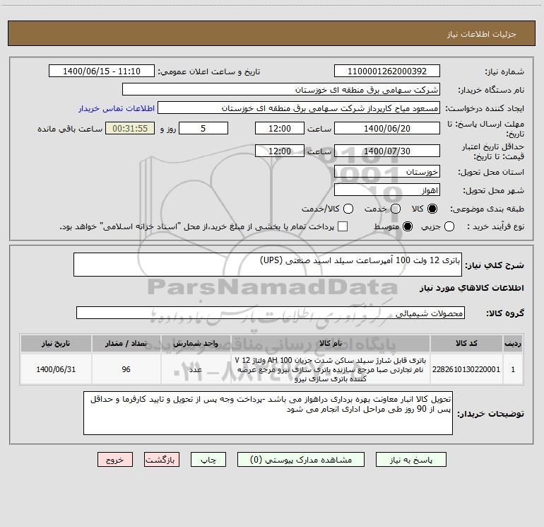 شرح کلی نیاز: باتری 12 ولت 100 آمپرساعت سیلد اسید صنعتی (UPS)