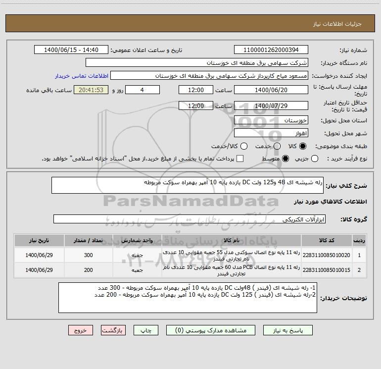 شرح کلی نیاز: رله شیشه ای 48 و125 ولت DC یازده پایه 10 آمپر بهمراه سوکت مربوطه
