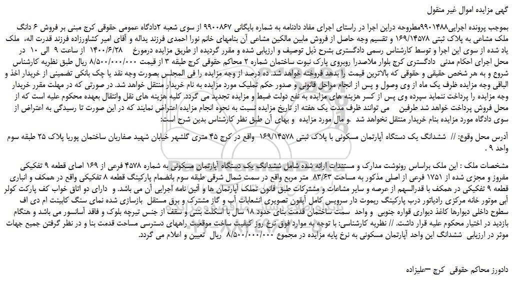 بموجب پرونده اجرایی9901488مطروحه دراین اجرا در راستای اجرای مفاد دادنامه به شماره بایگانی 9900867 از سوی شعبه 2دادگاه عمومی حقوقی کرج مبنی بر فروش 6 دانگ ملک مشاعی به پلاک ثبتی 169/14578 و تقسیم وجه حاصل از فروش مابین مالکین مشاعی آن بنامهای خانم نورا احمدی فرزند یداله و آقای امیر کشاورزاده فرزند قدرت اله،  ملک یاد شده از سوی این اجرا و توسط کارشناس رسمی دادگستری بشرح ذیل توصیف و ارزیابی شده و مقرر گردیده از طریق مزایده درمورخ    1400/6/28  از ساعت 9  الی 10  در محل اجرای احکام مدنی  دادگستری کرج بلوار ملاصدرا روبروی پارک نبوت ساختمان شماره 2 محاکم حقوقی کرج طبقه 3 از قیمت 8/500/000/000 ریال طبق نظریه کارشناس شروع و به هر شخص حقیقی و حقوقی که بالاترین قیمت را بدهد فروخته خواهد شد. ده درصد از وجه مزایده را فی المجلس بصورت وجه نقد یا چک بانکی تضمینی از خریدار اخذ و الباقی وجه مزایده ظرف یک ماه از وی وصول و پس از انجام مراحل قانونی و صدور حکم تملیک مورد مزایده به نام خریدار منتقل خواهد شد. در صورتی که در مهلت مقرر خریدار وجه مزایده را پرداخت ننماید سپرده وی پس از کسر هزینه های مزایده به نفع دولت ضبط و مزایده تجدید می گردد. کلیه هزینه های نقل وانتقال بعهده محکوم علیه است که از محل فروش پرداخت خواهد شد طرفین    می توانند ظرف مدت یک هفته از تاریخ مزایده نسبت به نحوه انجام مزایده اعتراض نمایند که در این صورت تا رسیدگی به اعتراض از سوی دادگاه مورد مزایده بنام خریدار منتقل نخواهد شد  .و مال مورد مزایده  و بهای آن طبق نظر کارشناس بدین شرح است: