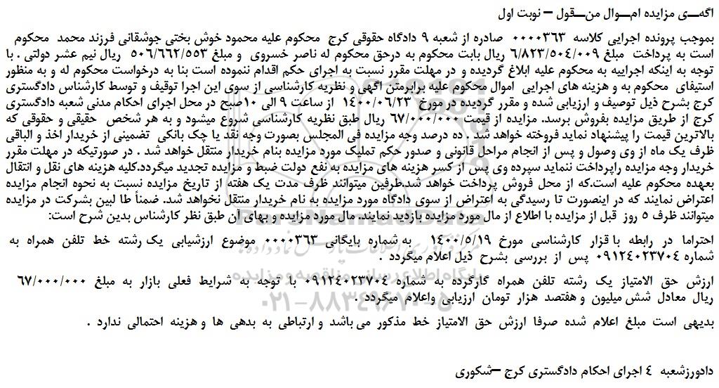 بموجب پرونده اجرایی کلاسه 0000363 صادره از شعبه 9 دادگاه حقوقی کرج محکوم علیه محمود خوش بختی جوشقانی فرزند محمد محکوم است به پرداخت مبلغ 6/823/504/009 ریال بابت محکوم به درحق محکوم له ناصر خسروی و مبلغ 506/662/553 ریال نیم عشر دولتی . با توجه به اینکه اجراییه به محکوم علیه ابلاغ گردیده و در مهلت مقرر نسبت به اجرای حکم اقدام ننموده است بنا به درخواست محکوم له و به منظور استیفای محکوم به و هزینه های اجرایی اموال محکوم علیه برابرمتن اگهی و نظریه کارشناسی از سوی این اجرا توقیف و توسط کارشناس دادگستری کرج بشرح ذیل توصیف و ارزیابی شده و مقرر گردیده در مورخ 1400/06/23 از ساعت 9 الی 10صبح در محل اجرای احکام مدنی شعبه دادگستری کرج از طریق مزایده بفروش برسد. مزایده از قیمت 67/000/000 ریال طبق نظریه کارشناسی شروع میشود و به هر شخص حقیقی و حقوقی که بالاترین قیمت را پیشنهاد نماید فروخته خواهد شد . ده درصد وجه مزایده فی المجلس بصورت وجه نقد یا چک بانکی تضمینی از خریدار اخذ و الباقی ظرف یک ماه از وی وصول و پس از انجام مراحل قانونی و صدور حکم تملیک مورد مزایده بنام خریدار منتقل خواهد شد . در صورتیکه در مهلت مقرر خریدار وجه مزایده راپرداخت ننماید سپرده وی پس از کسر هزینه های مزایده به نفع دولت ضبط و مزایده تجدید میگردد.کلیه هزینه های نقل و انتقال بعهده محکوم علیه است.که از محل فروش پرداخت خواهد شد.طرفین میتوانند ظرف مدت یک هفته از تاریخ مزایده نسبت به نحوه انجام مزایده اعتراض نمایند که در اینصورت تا رسیدگی به اعتراض از سوی دادگاه مورد مزایده به نام خریدار منتقل نخواهد شد. ضمناً طا لبین بشرکت در مزایده میتوانند ظرف 5 روز قبل از مزایده با اطلاع از مال مورد مزایده بازدید نمایند. مال مورد مزایده و بهای آن طبق نظر کارشناس بدین شرح است: