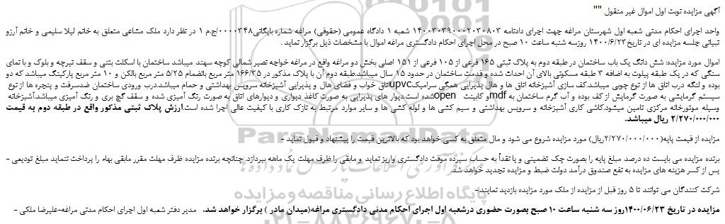- مزایده در تاریخ 1400/06/23روز سه شنبه ساعت 10 صبح بصورت حضوری درشعبه اول اجرای احکام مدنی دادگستری مراغه(میدان مادر ) برگزار خواهد شد.   مدیر دفتر شعبه اول اجرای احکام مدنی مراغه-علیرضا ملکی