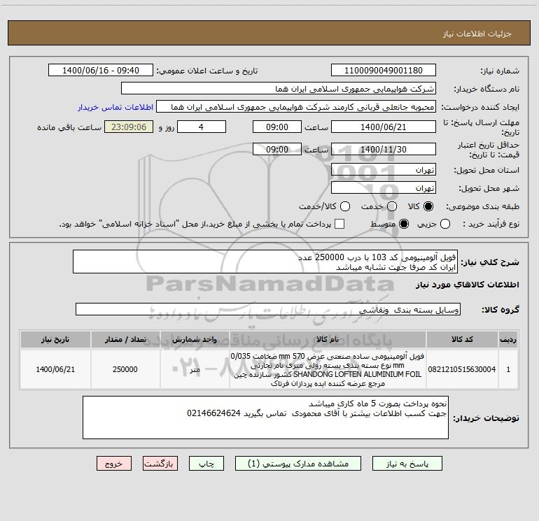 استعلام فویل آلومینیومی کد 103 با درب 250000 عدد ایران کد صرفا جهت تشابه میباشد , استعلام فویل آلومینیومی کد 103 با درب 250000 عدد ایران کد صرفا جهت تشابه میباشد