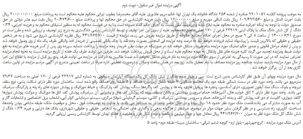 به موجب پرونده کلاسه 9901051 صادره از شعبه 256 دادگاه خانواده یک تهران لها: خانم مریم عاشوری علیه آقای محمدرضا یعقوب ایرانی محکوم علیه محکوم است به پرداخت مبلغ 300/000/000 ریال بابت اجرت المثل و مبلغ 109/493/560 ریال بابت الباقی مهریه و مبلغ 12/000/000 ریال بابت هزینه کارشناسی در حق محکوم لها و پرداخت مبلغ 20/474/600 ریال بابت نیم عشر دولتی در حق صندوق دولت با توجه به اینکه اجرائیه صادره به محکوم علیه ابلاغ شده و در مهلت مقرر نسبت به اجرای حکم اقدام ننموده است بنا به در خواست محکوم له به منظور استیفای محکوم به و هزینه اجرایی، 0/34 دانگ از کل شش دانگ ملک با پلاک ثبتی 33917 فرعی از 170 اصلی متعلق به محکوم علیه از سوی این اجرا توقیف و توسط کارشناس رسمی دادگستری به شرح زیر توصیف و ارزیابی شده و مقرر است در مورخ 1400/06/21 از ساعت 8 الی 9 صبح در محل اجرای احکام مجتمع خانواده از طریق مزایده بفروش می رسد، مزایده از قیمت 441/967/700 ریال نظریه کارشناسی شروع می شود و به هر شخص حقیقی و حقوقی که بالاترین قیمت را پیشنهاد نماید فروخته خواهد شد ده درصد وجه مزایده فی المجلس بصورت وجه نقد یا چک بانکی تضمینی از خریدار اخذ والباقی ظرف یک ماه از وی وصول خواهد شد و پس از انجام مراحل قانونی و صدور حکم تملیک مورد مزایده بنام خریدار منتقل خواهد شد در صورتیکه در مهلت مقرر خریدار وجه مزایده را پرداخت ننماید سپرده وی پس از کسر هزینه های مزایده به نفع دولت ضبط ومزایده تجدید می گردد کلیه هزینه های نقل وانتقال به عهده محکوم علیه است و از محل فروش پرداخت خواهد شد. طرفین می توانند ظرف یک هفته از تاریخ مزایده نسبت به نحوه انجام مزایده اعتراض نمایند که در این صورت تا رسیدگی به اعتراض از سوی دادگاه مورد مزایده به نام خریدار منتقل نخواهد شد ضمنا طالبین به شرکت در مزایده می توانند ظرف پنج روز قبل از مزایده با اطلاع این اجرا از مال مورد مزایده بازدید نمایند چنانچه روز مزایده مصادف با ایام تعطیل باشد روز بعد در همان ساعت و مکان و درصورت تعطیلی اداره صرفا در ساعت تعیینی مندرج در آگهی مراسم مزایده در اولین ساعت کاری بعد از آن برگزار خواهد شد .