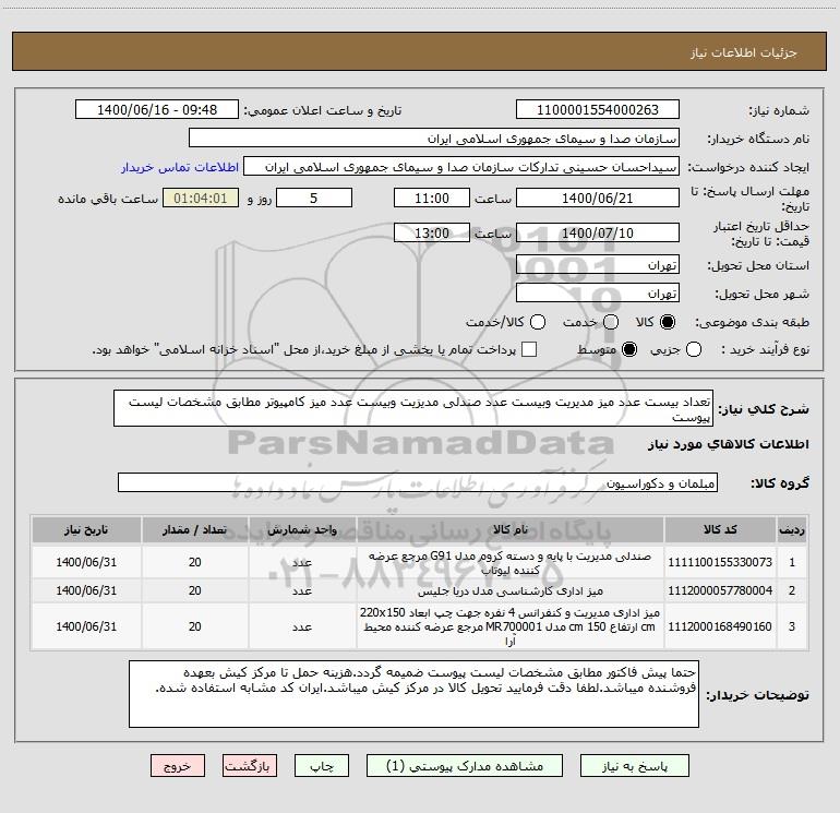 استعلام تعداد بیست عدد میز مدیریت وبیست عدد صندلی مدیزیت وبیست عدد میز کامپیوتر مطابق مشخصات لیست پیوست, استعلام تعداد بیست عدد میز مدیریت وبیست عدد صندلی مدیزیت وبیست عدد میز کامپیوتر مطابق مشخصات لیست پیوست