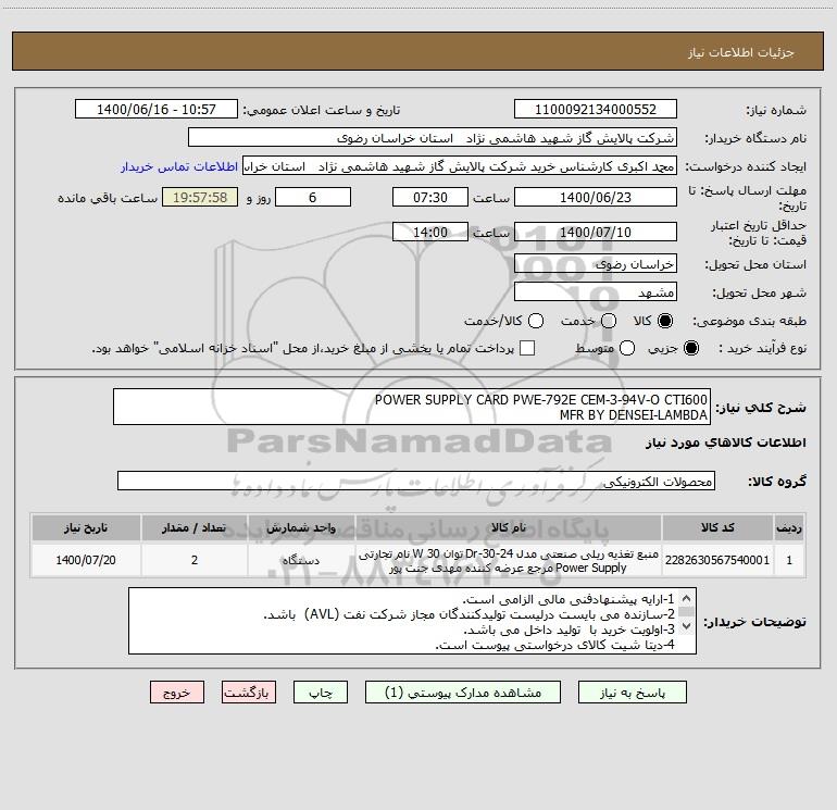 شرح کلی نیاز: POWER SUPPLY CARD PWE-792E CEM-3-94V-O CTI600
