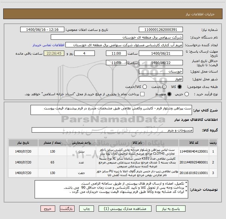 شرح کلی نیاز: ست پیراهن وشلوار فرم - کاپشن وکفش نظامی طبق مشخصات مندرج در فرم پیشنهاد قیمت پیوست