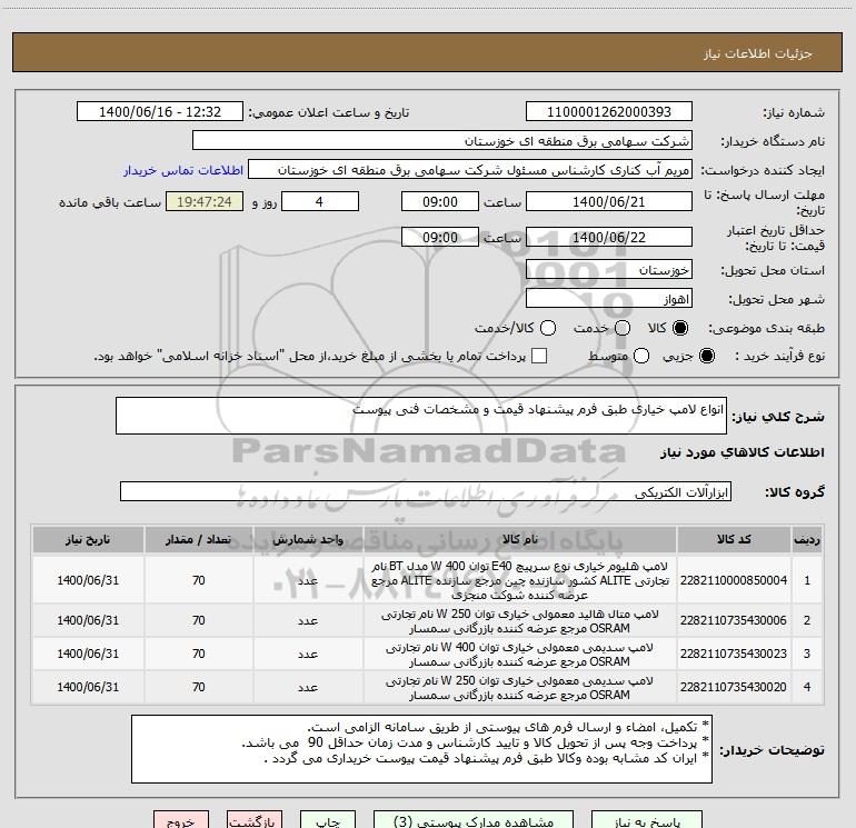 شرح کلی نیاز: انواع لامپ خیاری طبق فرم پیشنهاد قیمت و مشخصات فنی پیوست