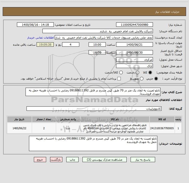 شرح کلی نیاز: تابلو لمینت به ابعاد یک متر در 70 طبق کپی مندرج در فایل 09188611392 رضایی با احتساب هزینه حمل به عهدی فروشنده