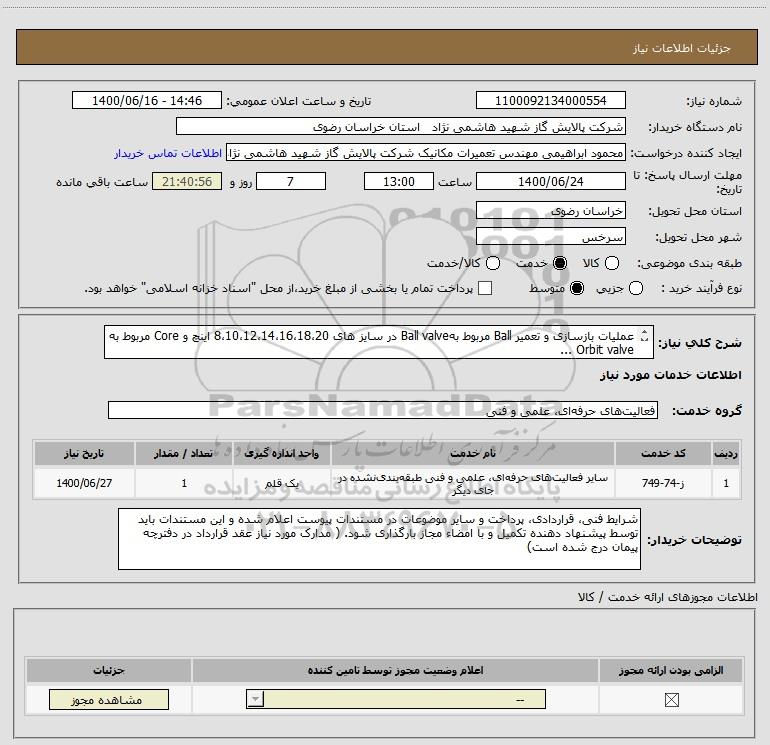 نام دستگاه خریدار:شرکت پالایش گاز شهید هاشمی نژاد استان خراسان رضوی