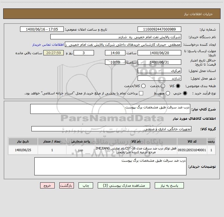 شرح کلی نیاز: درب ضد سرقت طبق مشخصات برگ پیوست