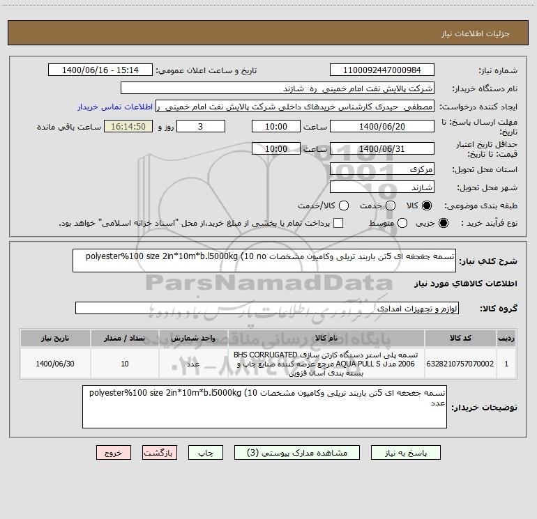 شرح کلی نیاز: تسمه جغحغه ای 5تن باربند تریلی وکامیون مشخصات polyester%100 size 2in*10m*b.l5000kg (10 no