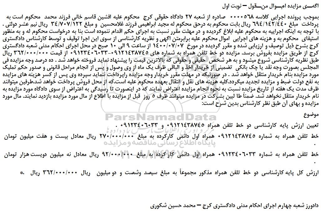 بموجب پرونده اجرایی کلاسه 0000568 صادره از شعبه 27 دادگاه حقوقی کرج محکوم علیه افشین قاسم خانی فرزند محمد محکوم است به پرداخت مبلغ 694/142/440 ریال بابت محکوم به درحق محکوم له مجید ابراهیمی فرزند غلامحسین و مبلغ 34/707/122 ریال نیم عشر دولتی . با توجه به اینکه اجراییه به محکوم علیه ابلاغ گردیده و در مهلت مقرر نسبت به اجرای حکم اقدام ننموده است بنا به درخواست محکوم له و به منظور استیفای محکوم به و هزینه های اجرایی اموال محکوم علیه برابرمتن اگهی و نظریه کارشناسی از سوی این اجرا توقیف و توسط کارشناس دادگستری کرج بشرح ذیل توصیف و ارزیابی شده و مقرر گردیده در مورخ 1400/07/07 از ساعت 9 الی 10 صبح در محل اجرای احکام مدنی شعبه دادگستری کرج از طریق مزایده بفروش برسد. مزایده دو خط تلفن همراه به شماره های 09121438745-09123406033 از قیمت 362/000/000 ریال طبق نظریه کارشناسی شروع میشود و به هر شخص حقیقی و حقوقی که بالاترین قیمت را پیشنهاد نماید فروخته خواهد شد . ده درصد وجه مزایده فی المجلس بصورت وجه نقد یا چک بانکی تضمینی از خریدار اخذ و الباقی ظرف یک ماه از وی وصول و پس از انجام مراحل قانونی و صدور حکم تملیک مورد مزایده بنام خریدار منتقل خواهد شد . در صورتیکه در مهلت مقرر خریدار وجه مزایده راپرداخت ننماید سپرده وی پس از کسر هزینه های مزایده به نفع دولت ضبط و مزایده تجدید میگردد.کلیه هزینه های نقل و انتقال بعهده محکوم علیه است.که از محل فروش پرداخت خواهد شد.طرفین میتوانند ظرف مدت یک هفته از تاریخ مزایده نسبت به نحوه انجام مزایده اعتراض نمایند که در اینصورت تا رسیدگی به اعتراض از سوی دادگاه مورد مزایده به نام خریدار منتقل نخواهد شد. ضمناً طا لبین بشرکت در مزایده میتوانند ظرف 5 روز قبل از مزایده با اطلاع از مال مورد مزایده بازدید نمایند. مال مورد مزایده و بهای آن طبق نظر کارشناس بدین شرح است:
