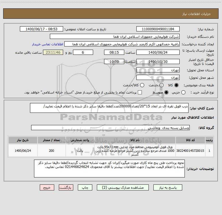 استعلام درب فویل نقره ای در ابعاد 15*20/تعداد200000عدد/لطفا دقیقا سایز ذکر شده را اعلام قیمت نمایید/ , استعلام درب فویل نقره ای در ابعاد 15*20/تعداد200000عدد/لطفا دقیقا سایز ذکر شده را اعلام قیمت نمایید/