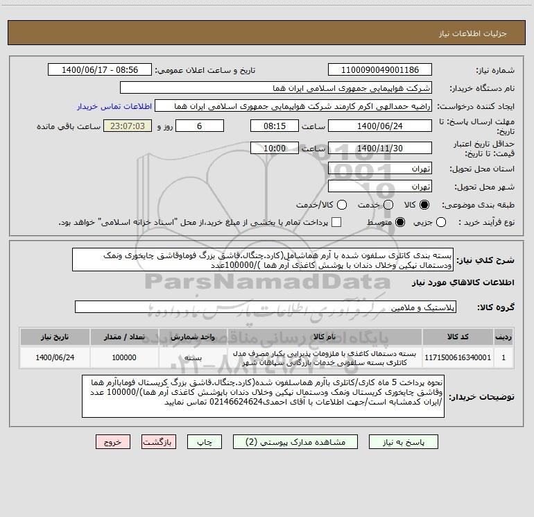 توضیحات خریدار:نحوه پرداخت 5 ماه کاری/کاتلری باآرم هماسلفون شده(کارد.چنگال.قاشق بزرگ کریستال فوماباآرم هما وقاشق چایخوری کریستال ونمک ودستمال نپکین وخلال دندان باپوشش کاغذی آرم هما)/100000 عدد /ایران کدمشابه است/جهت اطلاعات با آقای احمدی02146624624 تماس نمایید