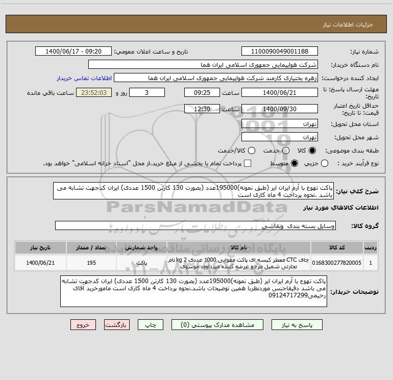 شرح کلی نیاز: پاکت تهوع با آرم ایران ایر (طبق نمونه)195000عدد (بصورت 130 کارتن 1500 عددی) ایران کدجهت تشابه می باشد .نحوه پرداخت 4 ماه کاری است