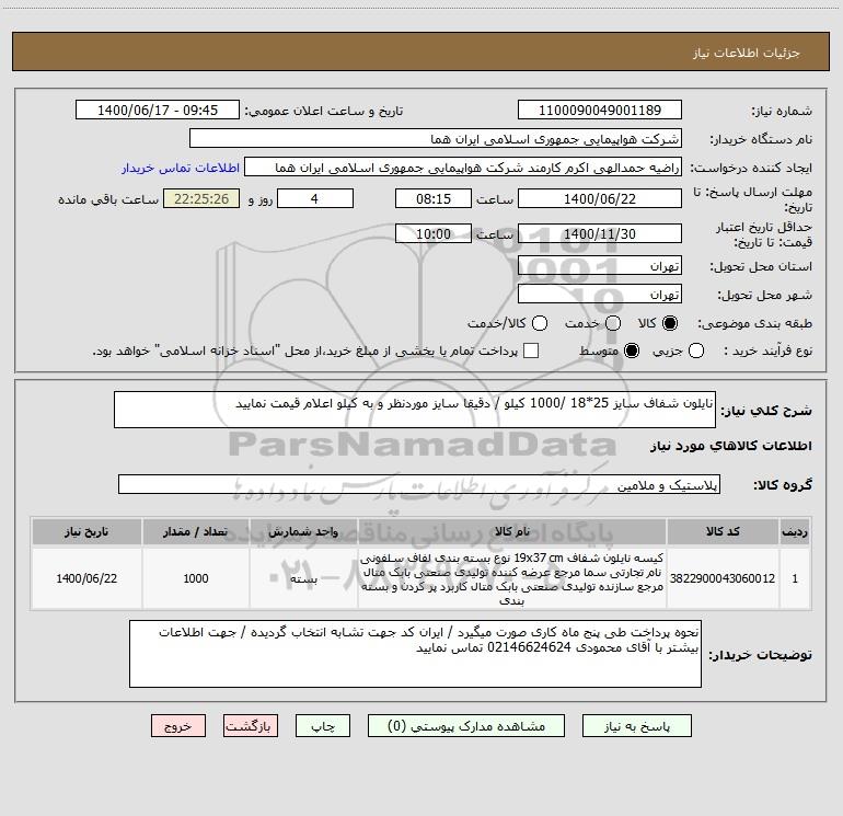 شرح کلی نیاز: نایلون شفاف سایز 25*18 /1000 کیلو / دقیقا سایز موردنظر و به کیلو اعلام قیمت نمایید