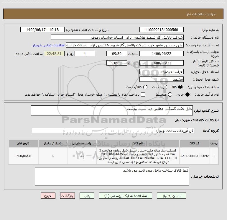 نام دستگاه خریدار:شرکت پالایش گاز شهید هاشمی نژاد استان خراسان رضوی