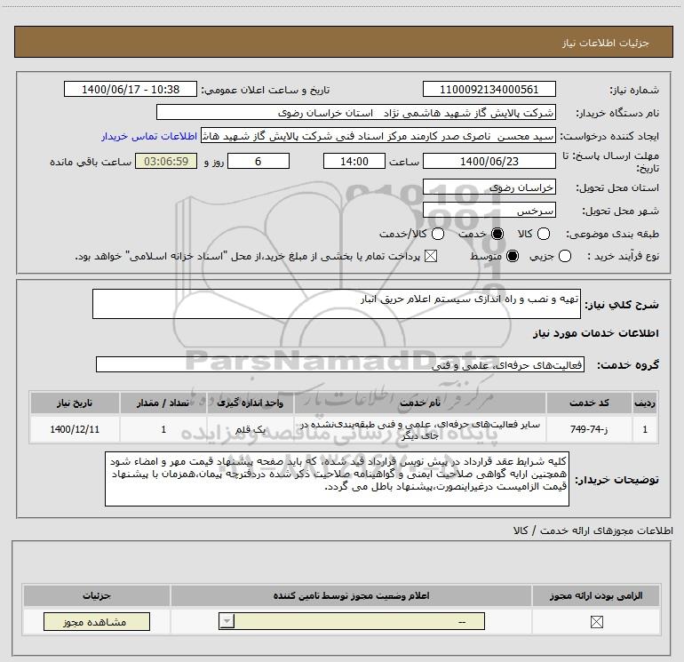 نام دستگاه خریدار:شرکت پالایش گاز شهید هاشمی نژاد استان خراسان رضوی