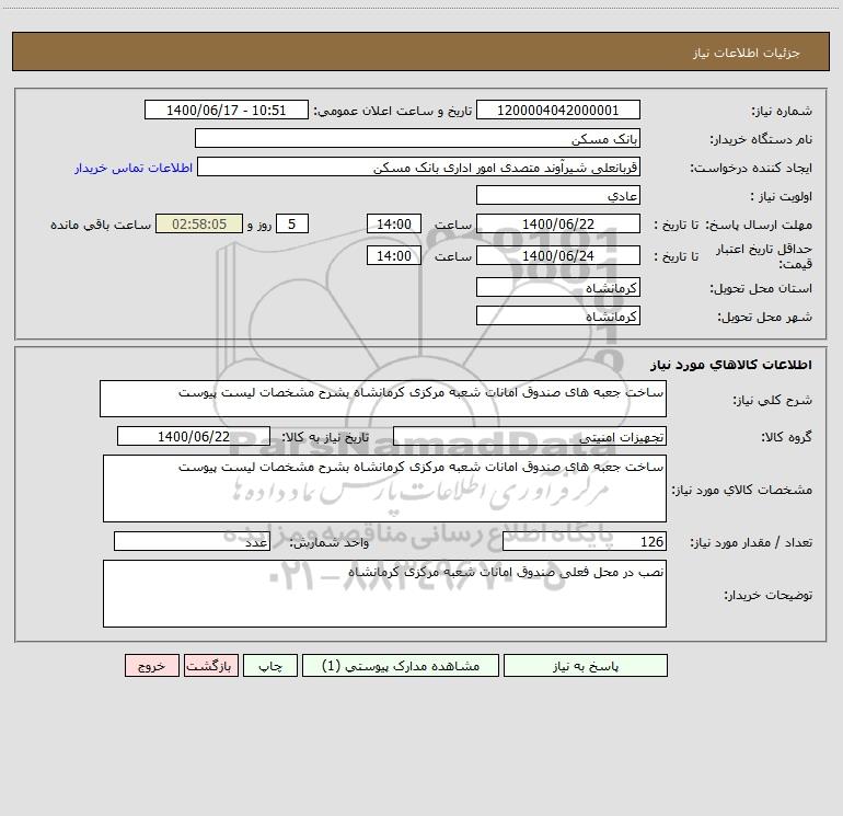 شرح کلی نیاز: ساخت جعبه های صندوق امانات شعبه مرکزی کرمانشاه بشرح مشخصات لیست پیوست