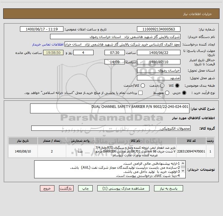نام دستگاه خریدار:شرکت پالایش گاز شهید هاشمی نژاد استان خراسان رضوی