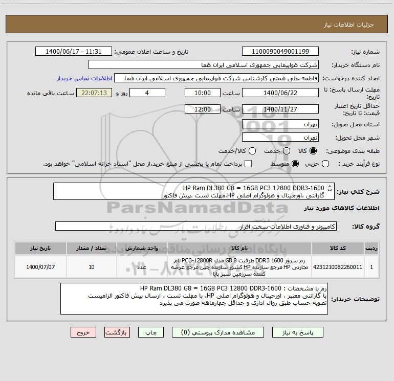 نام دستگاه خریدار:شرکت هواپیمایی جمهوری اسلامی ایران هما