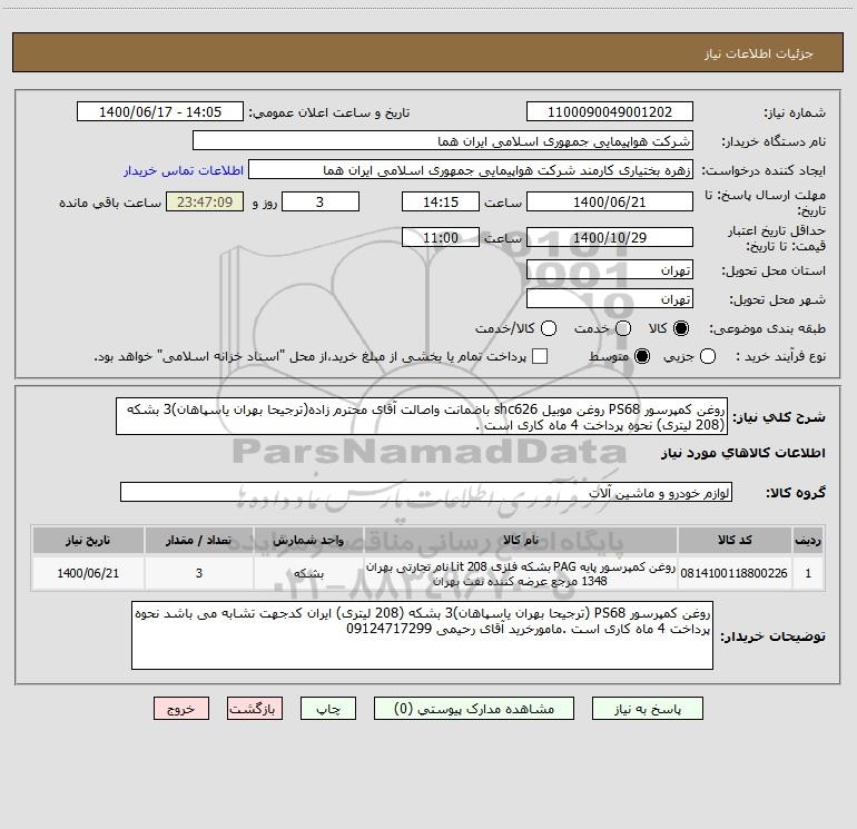 شرح کلی نیاز: روغن کمپرسور PS68 روغن موبیل shc626 باضمانت واصالت آقای محترم زاده(ترجیحا بهران یاسپاهان)3 بشکه (208 لیتری) نحوه پرداخت 4 ماه کاری است .