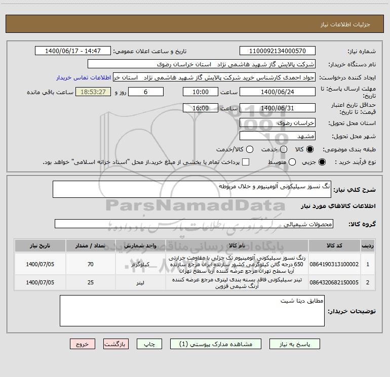 نام دستگاه خریدار:شرکت پالایش گاز شهید هاشمی نژاد استان خراسان رضوی