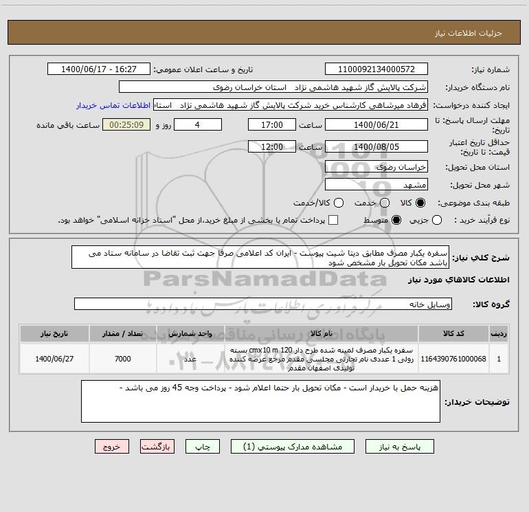 نام دستگاه خریدار:شرکت پالایش گاز شهید هاشمی نژاد استان خراسان رضوی