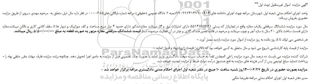 مزایده فروش ششدانگ سرقفلی یکباب مغازه, مزایده فروش ششدانگ سرقفلی یکباب مغازه