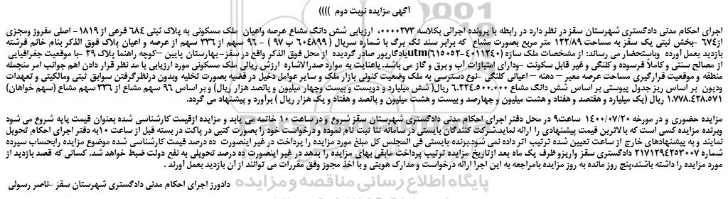 اجرای احکام مدنی دادگستری شهرستان سقز در نظر دارد در رابطه با پرونده اجرائی بکلاسه 0000273، ارزیابی شش دانگ مشاع عرصه واعیان ملک مسکونی به پلاک ثبتی 684 فرعی از 1819- اصلی مفروز ومجزی از674 -بخش ثبتی یک سقز به مساحت 122/89 متر مربع بصورت مشاع که برابر سند تک برگ با شماره سریال ( 604899 ب 97 ) - 96 سهم از 336 سهم از عرصه و اعیان پلاک فوق الذکر بنام خانم فرشته یادگارپور صادر گردیده از محل فوق الذکر واقع در سقز- بهارستان پایین –کوچه راهنما پلاک 29 -با موقعیت جغرافیایی utm(615052-4011240) بازدید بعمل آورده وباستحضار می رساند: از مشخصات ملک سازه از مصالح سنتی و کاملاً فرسوده و کلنگی و غیر قابل سکونت -ودارای امتیازات آب و برق و گاز می باشد. باعنایت به موارد صدرالاشاره ارزش ریالی ملک مسکونی مورد ارزیابی با مد نظر قرار دادن اهم جوانب امر منجمله منطقه و موقعیت قرارگیری مساحت عرصه معبر – دهنه – اعیانی کلنگی -نوع دسترسی به ملک وضعیت کنونی بازار ملک و سایر عوامل دخیل در قضیه بصورت تخلیه وبدون درنظرگرفتن سوابق ثبتی ومالکیتی و تعهدات ودیون بر اساس ریز جدول پیوستی بر اساس شش دانگ مشاع 6.224.500.000 ریال( شش میلیارد و دویست و بیست وچهار میلیون و پانصد هزار ریال) و بر اساس 96 سهم مشاع از 336 سهم مشاع (سهم خواهان) 1.778.428.571 ریال (یک میلیارد و هفتصد و هفتاد و هشت میلیون و چهارصد و بیست و هشت میلیون و پانصد و هفتاد و یک هزار ریال ) برآورد و پیشنهاد می گردد.