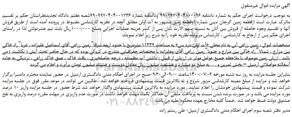 بنابراین جلسه مزایده به روز سه شنبه مورخه 1400/07/06ساعت 09:00الی09:30صبح در اجرای احکام مدنی دادگستری اردبیل در حضور نماینده محترم دادسرا برگزار خواهد شد و مزایده از مبلغ معینه کارشناسی مزبور شروع و به بالاترین قیمت پیشنهادی فروخته خواهد شد . طالبین می توانند در موعد مقرر فوق در جلسه مزایده شرکت نموده و قیمت پیشنهادی خودشان را اعلام نمایند . مورد مزایده به بالاترین قیمت پیشنهادی واگذار خواهد شد شرط حضور در جلسه مزایده واریز 10 درصد مورد مزایده می باشد و در صورت برنده شدن نسبت به پرداخت مابقی آن حداکثر یکماه مهلت خواهد داشت در صورت عدم واریزی در مهلت مقرره درصد واریزی به نفع صندوق دولت ضبط خواهد شد . ضمناً کلیه مخارج بعهده محکوم علیه می باشد.