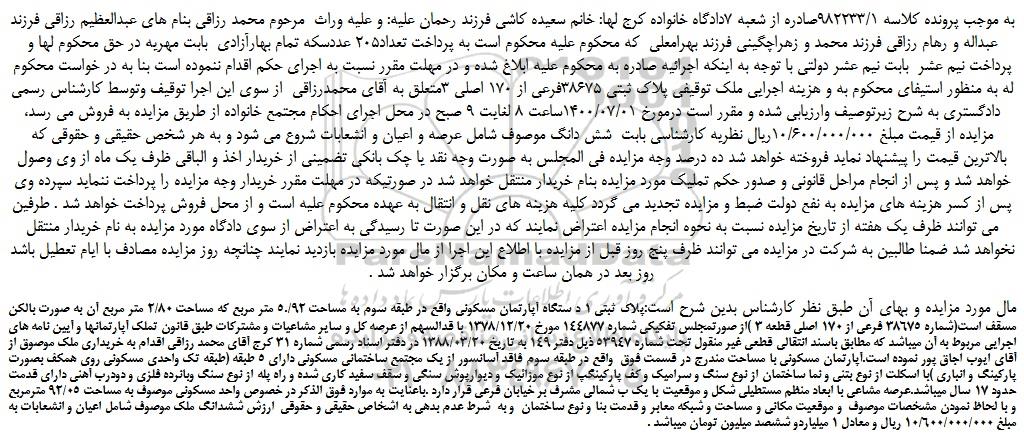 به موجب پرونده کلاسه 982233/1صادره از شعبه 7دادگاه خانواده کرج لها: خانم سعیده کاشی فرزند رحمان علیه: و علیه وراث مرحوم محمد رزاقی بنام های عبدالعظیم رزاقی فرزند عبداله و رهام رزاقی فرزند محمد و زهراچگینی فرزند بهرامعلی که محکوم علیه محکوم است به پرداخت تعداد205 عددسکه تمام بهارآزادی بابت مهریه در حق محکوم لها و پرداخت نیم عشر بابت نیم عشر دولتی با توجه به اینکه اجرائیه صادره به محکوم علیه ابلاغ شده و در مهلت مقرر نسبت به اجرای حکم اقدام ننموده است بنا به در خواست محکوم له به منظور استیفای محکوم به و هزینه اجرایی ملک توقیفی پلاک ثبتی 38675فرعی از 170 اصلی 3متعلق به آقای محمدرزاقی از سوی این اجرا توقیف وتوسط کارشناس رسمی دادگستری به شرح زیرتوصیف وارزیابی شده و مقرر است درمورخ 1400/07/01ساعت 8 لغایت 9 صبح در محل اجرای احکام مجتمع خانواده از طریق مزایده به فروش می رسد، مزایده از قیمت مبلغ 10/600/000/000ریال نظریه کارشناسی بابت شش دانگ موصوف شامل عرصه و اعیان و انشعابات شروع می شود و به هر شخص حقیقی و حقوقی که بالاترین قیمت را پیشنهاد نماید فروخته خواهد شد ده درصد وجه مزایده فی المجلس به صورت وجه نقد یا چک بانکی تضمینی از خریدار اخذ و الباقی ظرف یک ماه از وی وصول خواهد شد و پس از انجام مراحل قانونی و صدور حکم تملیک مورد مزایده بنام خریدار منتقل خواهد شد در صورتیکه در مهلت مقرر خریدار وجه مزایده را پرداخت ننماید سپرده وی پس از کسر هزینه های مزایده به نفع دولت ضبط و مزایده تجدید می گردد کلیه هزینه های نقل و انتقال به عهده محکوم علیه است و از محل فروش پرداخت خواهد شد . طرفین می توانند ظرف یک هفته از تاریخ مزایده نسبت به نحوه انجام مزایده اعتراض نمایند که در این صورت تا رسیدگی به اعتراض از سوی دادگاه مورد مزایده به نام خریدار منتقل نخواهد شد ضمنا طالبین به شرکت در مزایده می توانند ظرف پنج روز قبل از مزایده با اطلاع این اجرا از مال مورد مزایده بازدید نمایند چنانچه روز مزایده مصادف با ایام تعطیل باشد روز بعد در همان ساعت و مکان برگزار خواهد شد .