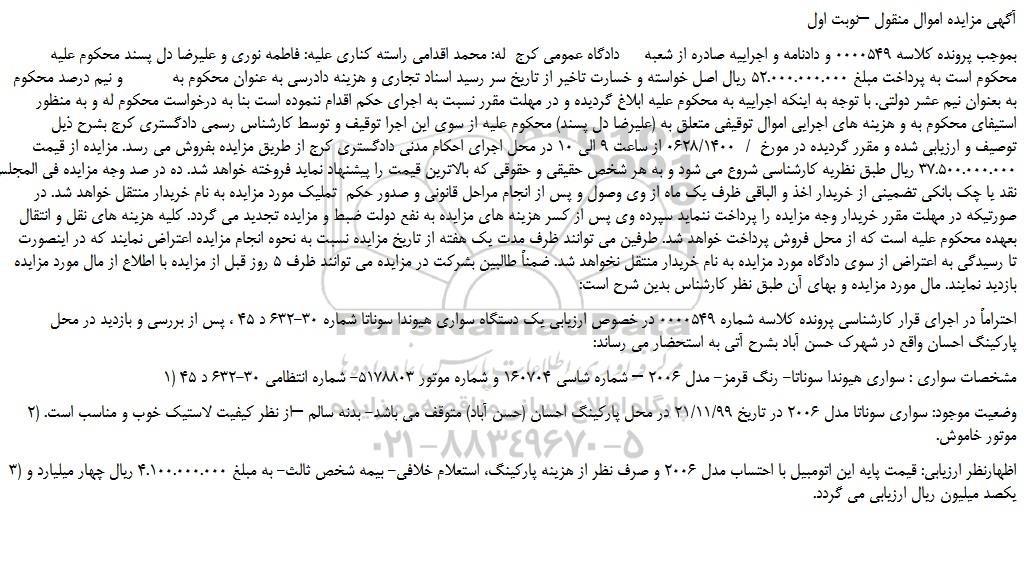 بموجب پرونده کلاسه 0000549 و دادنامه و اجراییه صادره از شعبه دادگاه عمومی کرج له: محمد اقدامی راسته کناری علیه: فاطمه نوری و علیرضا دل پسند محکوم علیه محکوم است به پرداخت مبلغ 52.000.000.000 ریال اصل خواسته و خسارت تاخیر از تاریخ سر رسید اسناد تجاری و هزینه دادرسی به عنوان محکوم به و نیم درصد محکوم به بعنوان نیم عشر دولتی. با توجه به اینکه اجراییه به محکوم علیه ابلاغ گردیده و در مهلت مقرر نسبت به اجرای حکم اقدام ننموده است بنا به درخواست محکوم له و به منظور استیفای محکوم به و هزینه های اجرایی اموال توقیفی متعلق به (علیرضا دل پسند) محکوم علیه از سوی این اجرا توقیف و توسط کارشناس رسمی دادگستری کرج بشرح ذیل توصیف و ارزیابی شده و مقرر گردیده در مورخ / 0628/1400 از ساعت 9 الی 10 در محل اجرای احکام مدنی دادگستری کرج از طریق مزایده بفروش می رسد. مزایده از قیمت 37.500.000.000 ریال طبق نظریه کارشناسی شروع می شود و به هر شخص حقیقی و حقوقی که بالاترین قیمت را پیشنهاد نماید فروخته خواهد شد. ده در صد وجه مزایده فی المجلس بصورت وجه نقد یا چک بانکی تضمینی از خریدار اخذ و الباقی ظرف یک ماه از وی وصول و پس از انجام مراحل قانونی و صدور حکم تملیک مورد مزایده به نام خریدار منتقل خواهد شد. در صورتیکه در مهلت مقرر خریدار وجه مزایده را پرداخت ننماید سپرده وی پس از کسر هزینه های مزایده به نفع دولت ضبط و مزایده تجدید می گردد. کلیه هزینه های نقل و انتقال بعهده محکوم علیه است که از محل فروش پرداخت خواهد شد. طرفین می توانند ظرف مدت یک هفته از تاریخ مزایده نسبت به نحوه انجام مزایده اعتراض نمایند که در اینصورت تا رسیدگی به اعتراض از سوی دادگاه مورد مزایده به نام خریدار منتقل نخواهد شد. ضمناً طالبین بشرکت در مزایده می توانند ظرف 5 روز قبل از مزایده با اطلاع از مال مورد مزایده بازدید نمایند. مال مورد مزایده و بهای آن طبق نظر کارشناس بدین شرح است: