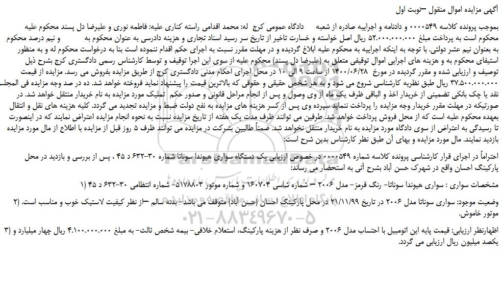 1) مشخصات سواری : سواری هیوندا سوناتا- رنگ قرمز- مدل 2006 – شماره شاسی 160704 و شماره موتور 5178803- شماره انتظامی 30-632 د 45