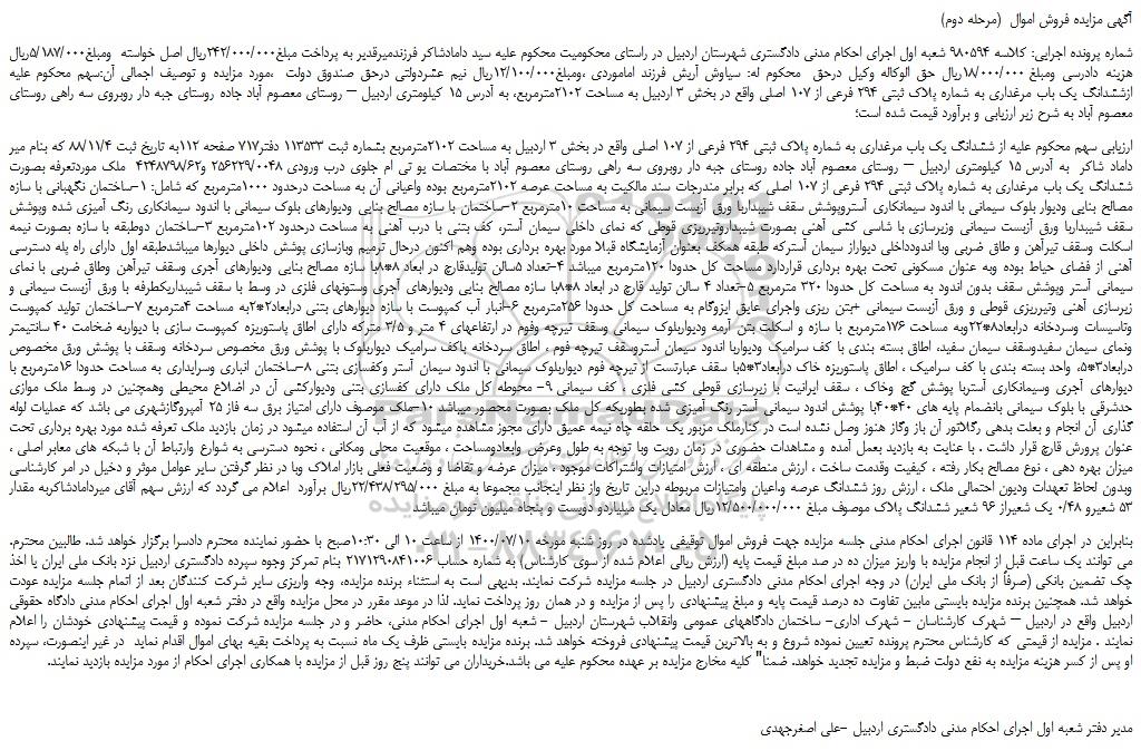 شماره پرونده اجرایی: کلاسه 980594 شعبه اول اجرای احکام مدنی دادگستری شهرستان اردبیل در راستای محکومیت محکوم علیه سید دامادشاکر فرزندمیرقدیر به پرداخت مبلغ242/000/000ریال اصل خواسته ومبلغ5/187/000ریال هزینه دادرسی ومبلغ 18/000/000ریال حق الوکاله وکیل درحق محکوم له: سیاوش آریش فرزند اماموردی ،ومبلغ12/100/000ریال نیم عشردولتی درحق صندوق دولت ،مورد مزایده و توصیف اجمالی آن:سهم محکوم علیه ازششدانگ یک باب مرغداری به شماره پلاک ثبتی 294 فرعی از 107 اصلی واقع در بخش 3 اردبیل به مساحت 2102مترمربع، به آدرس 15 کیلومتری اردبیل – روستای معصوم آباد جاده روستای جبه دار روبروی سه راهی روستای معصوم آباد به شرح زیر ارزیابی و برآورد قیمت شده است؛