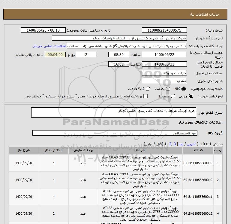 نام دستگاه خریدار:شرکت پالایش گاز شهید هاشمی نژاد استان خراسان رضوی