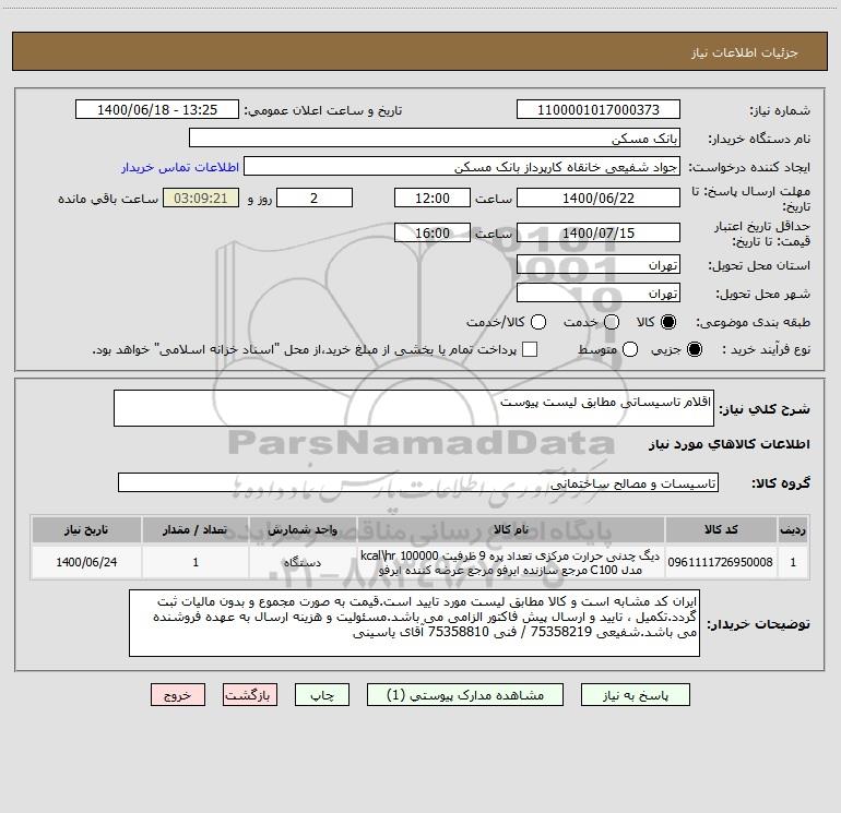 شرح کلی نیاز: اقلام تاسیساتی مطابق لیست پیوست