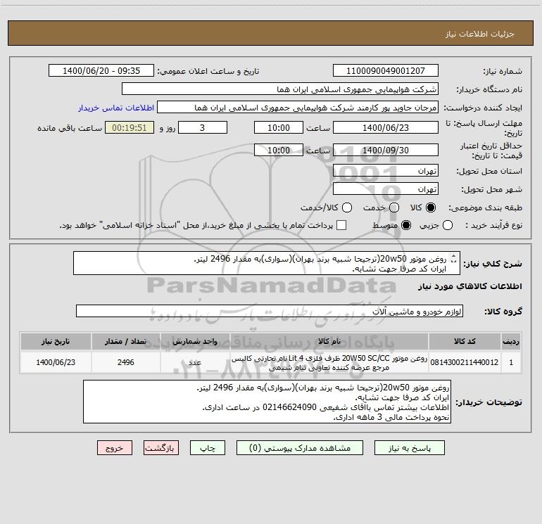 شرح کلی نیاز: روغن موتور 20w50(ترجیحا شبیه برند بهران)(سواری)به مقدار 2496 لیتر. ایران کد صرفا جهت تشابه. اطلاعات بیشتر توضیحات مطالعه شود.