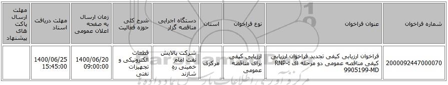 | 2000092447000070 | فراخوان ارزیابی کیفی تجدید فراخوان ارزیابی کیفی مناقصه عمومی دو مرحله ای :RNP-9905199-MD | ارزیابی کیفی برای مناقصه عمومی | مرکزی | شرکت پالایش نفت امام خمینی ره شازند | قطعات الکترونیکی و تجهیزات نفتی | 1400/06/20 09:00:00 | 1400/06/25 15:45:00 |